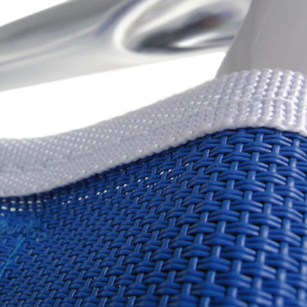 The textilene material is a PVC coated polyester non stretch yarn. The fabric is very strong, 580gr/m2 and can support up to 120 kg weight. The fabric is able to withstand compression efforts, atmospheric agents, rips and UV rays. The textilene fabrics allow water to drip through it so it is ideal for people sitting with wet suits. Furthermore it is easily cleaned and requires minimal